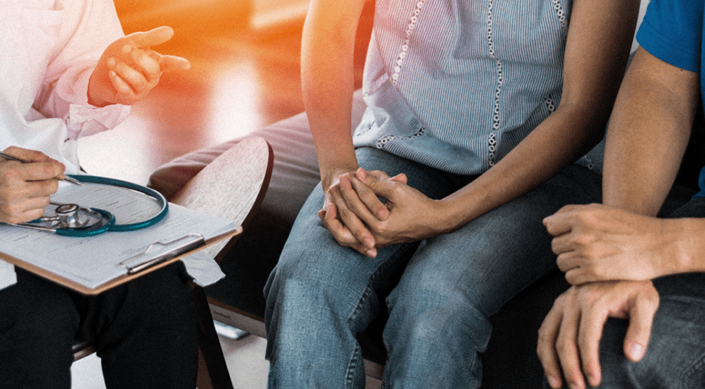 A man and woman consulting a doctor about their sexual health.